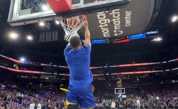 轻松写意!库里赛前自抛自接 完成了一个空接背扣